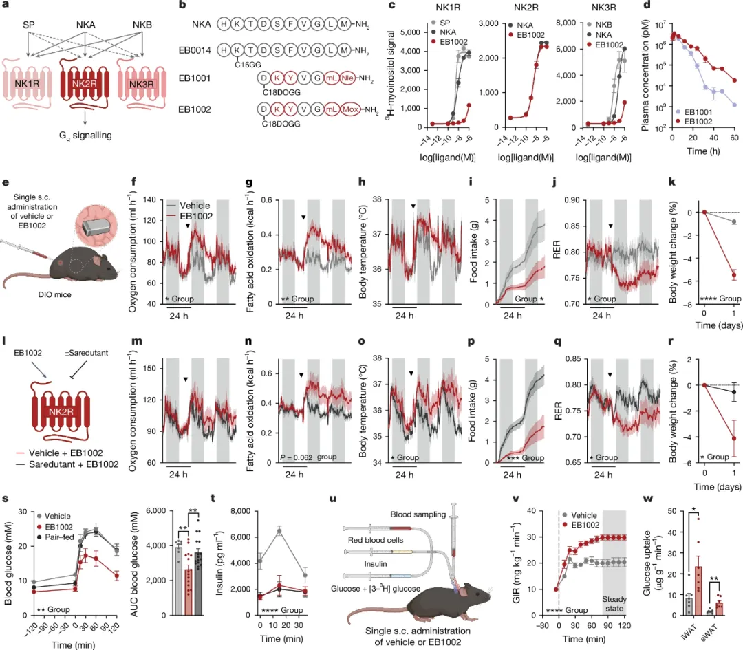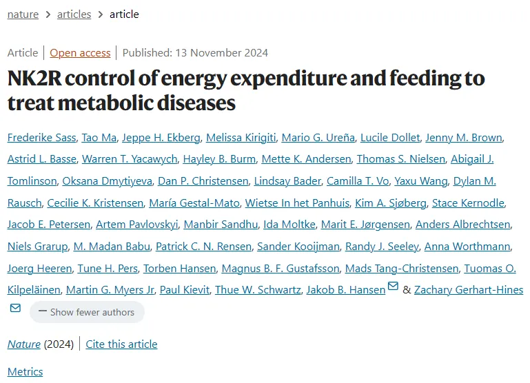 近年来,全球有数百万患者因司美格鲁肽等GLP-1类减肥药物的问世而受益,这些药物不仅有减重功能,还具备改善肾功能、降低致命心脏事件的风险,以及预防神经退行性病变等多重益处。然而,不少患者因无法忍受常见的副作用(恶心、呕吐等),而不得不中断治疗。在此背景下,丹麦哥本哈根大学的科学家取得了一项突破性发现,他们发现了一种新的减肥药物靶点——NK2R。他们开发的first-in-class选择性长效NK2R激动剂,不仅能有效降低食欲,而且不会导致肌肉质量减少,也不会引起恶心、呕吐等不良反应。更重要的是,与现有治疗方法相比,这款药物还能促进身体热量的消耗。这一开创性的研究成果已于11月13日发表在Nature杂志上。这项发现为那些对现行治疗方案反应不佳的肥胖症和2型糖尿病患者带来了新的希望,预示着一种全新治疗策略的诞生。
