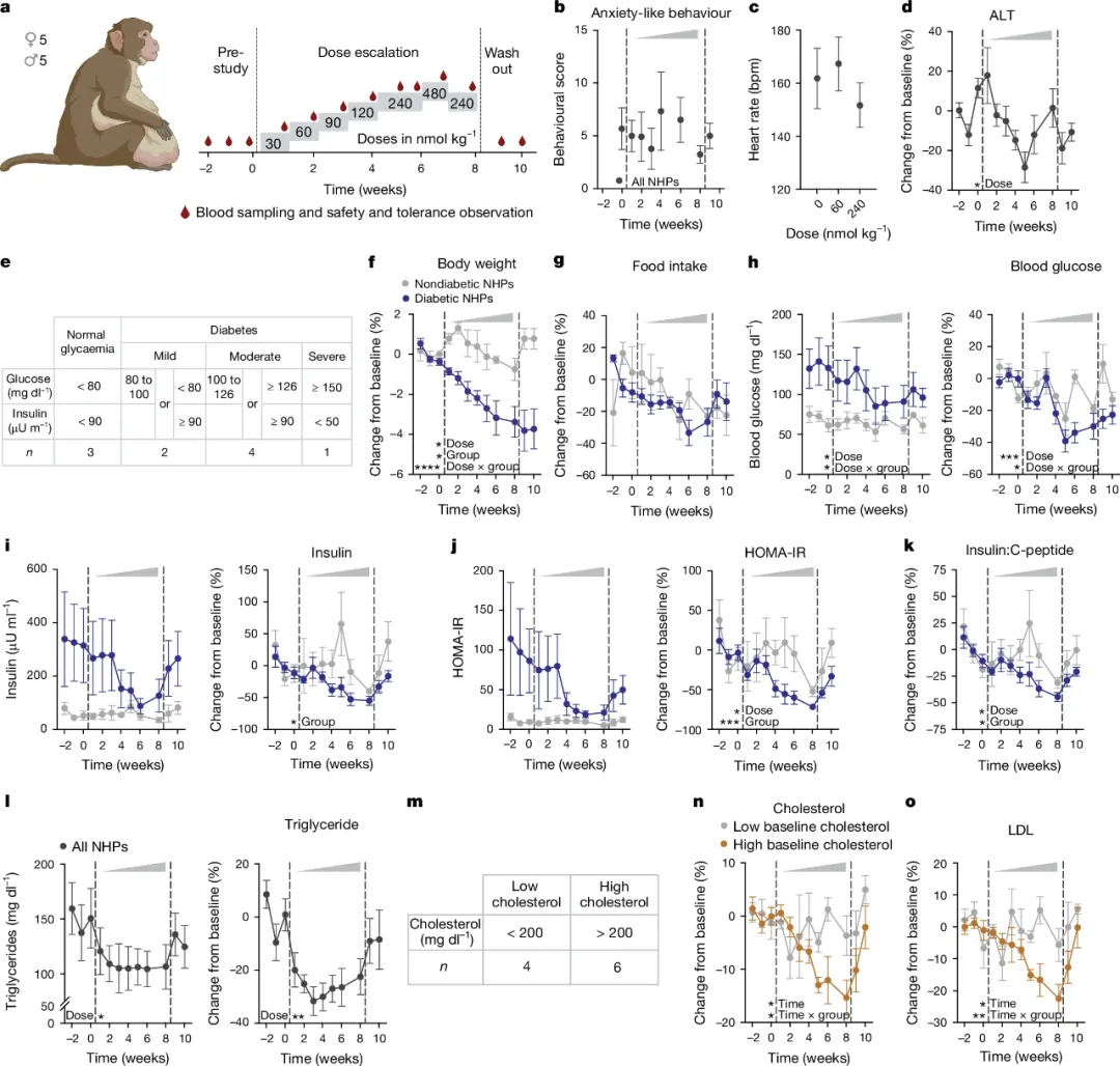 在后续研究中,科研人员对患有2型糖尿病和肥胖的非人灵长类动物进行了深入研究。结果表明,激活NK2R受体能够通过提升胰岛素敏感性、降低血糖水平以及减少甘油三酯和胆固醇的含量,有效减轻体重并逆转糖尿病的症状。
