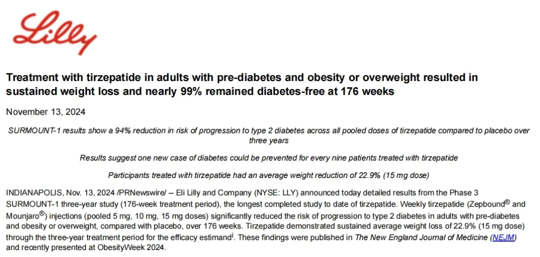 新闻稿显示,SURMOUNT-1 (NCT04184622)是一项多中心、随机、双盲、平行、安慰剂对照试验,比较了替尔泊肽5mg、10mg和15mg与安慰剂作为降低卡路里饮食和增加体力活动的辅助治疗,适用于无2型糖尿病、肥胖或超重且至少有以下合并症之一的成年人:高血压、血脂异常、阻塞性睡眠呼吸暂停(OSA)或心血管疾病。1032名在研究开始时患有糖尿病前期(pre-diabetes)的参与者在最初的72周研究结束后参加SURMOUNT-1治疗,继续进行104周的治疗,以评估替尔泊肽治疗3年后对体重的影响以及与安慰剂相比进展为2型糖尿病方面的潜在差异。