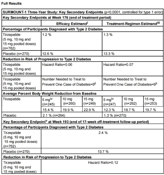 在额外的终点指标中,研究显示替尔泊肽治疗与血糖控制改善、心血管代谢风险因素(包括空腹胰岛素、血压和血脂)改善以及健康相关生活质量改善有关,这些改善在 176 周内持续存在。一项事后中介分析表明,替尔泊肽导致 2 型糖尿病发病延迟的观察到效应中,约有一半与药物引起的体重减轻有关,其余益处可能归因于 替尔泊肽的其他效应。