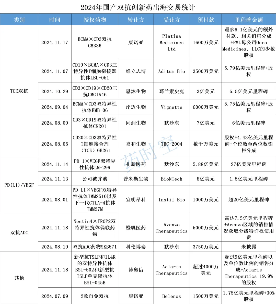 可以说,目前国内已经迎来了一波双抗药物出海潮。在国内直接IPO融资受限受阻后,中国创新药正在通过出海形成新的资金来源,新的循环正在形成。本文统计了2024年至今国内双抗药物的授权出海交易,共涉及12家中国企业,总交易价值超127亿美元。从双抗类型看,TCE双抗相关交易占近一半,其他则为PD(L1)/VEGF双抗、双抗ADC等。下面为相关交易详情,若有遗漏,欢迎留言补充。