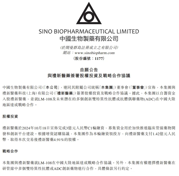 11月20日早上,中国生物制药公告宣布,其与创新药企业礼新医药签署了股权投资及战略合作协议。