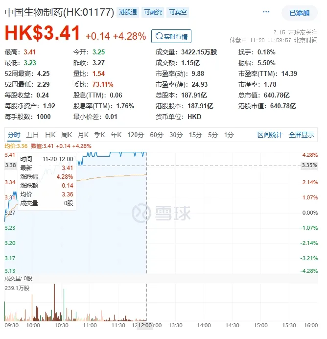 在11月20日早间宣布与礼新医药的合作后,开盘后中国生物制药股价波动上涨,截至中午休盘,股价涨幅4.28%,报3.41港元/股,总市值640.78亿港元。