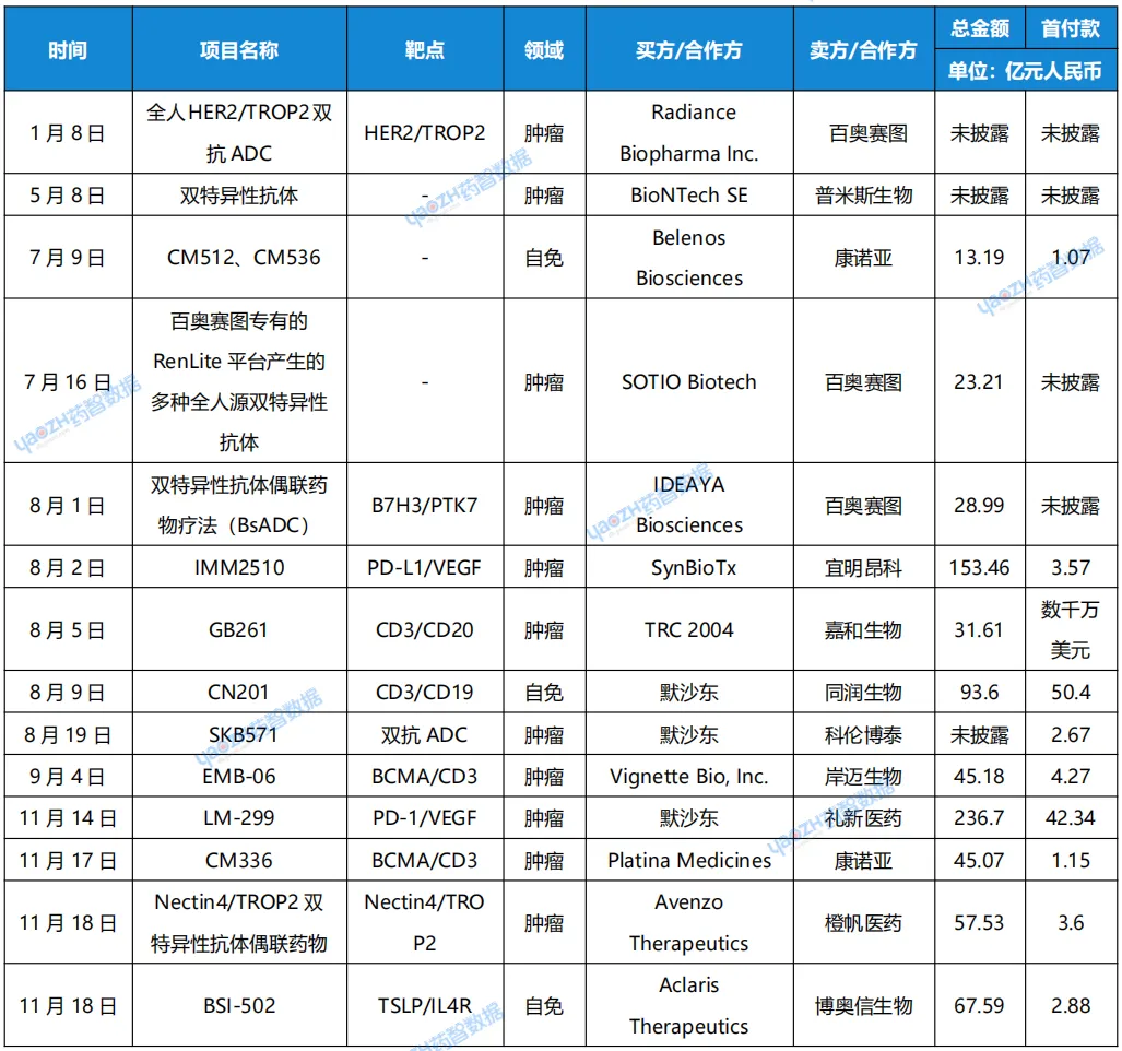 此外,同润生物授权予默沙东的CD3xCD19双抗CN201项目,总交易金额也达到了93.6亿元。据了解,该项目的首付款高达7亿美元,是中国Biotech出海交易获得的第二大首付款。