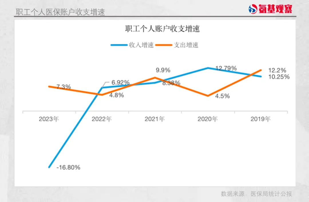 更进一步来看,职工医保统筹账户相对健康,但职工医保个人账户和居民医保压力均较大。收入方面增速持续下滑,支出却仍在保持较快增速,导致这两个账户在2023年基本结余大幅缩水,分别为253.39亿元和112.06亿元。