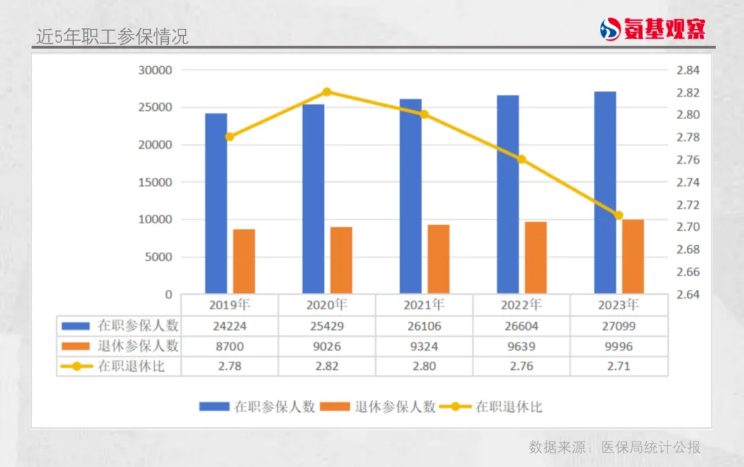 尽管当前在人口老龄化的严峻形势下,医保基金的长期压力正在增加。比如十年前,还是3个在职职工养1个退休职工,去年职工基本医疗保险职退比降到了2.71。