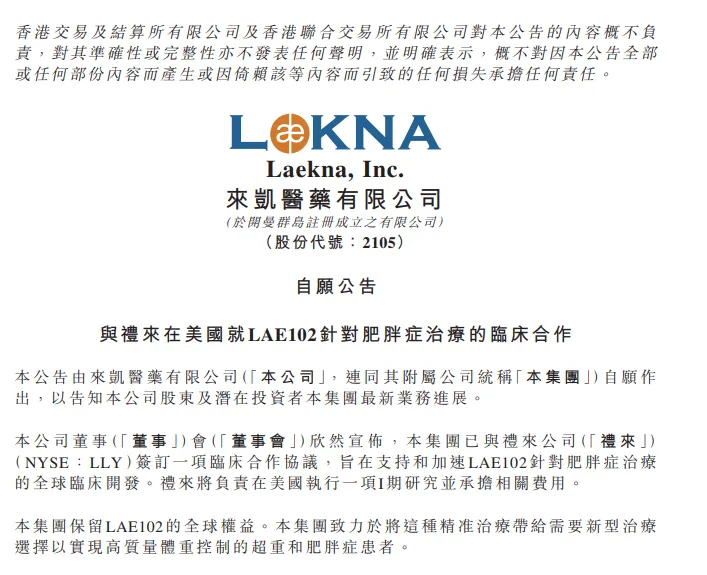 来凯医药表示,公司将保留LAE102的全球权益。公司致力于将这种精准治疗带给需要新型治疗选择,以实现高质量体重控制的超重和肥胖症患者。