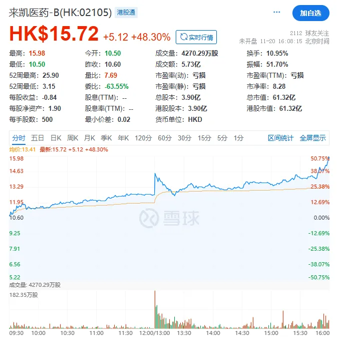 受此消息的影响,来凯医药股价大涨48.3%,报15.72港元/股,总市值61.32亿港币。