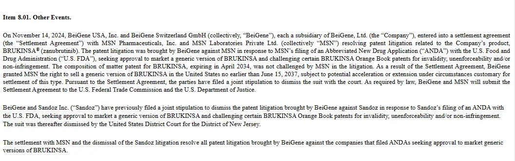 百济神州称,与 MSN 的和解和对山德士诉讼的驳回解决了百济神州针对提交 ANDA 申请批准销售泽布替尼仿制药的公司提起的所有专利诉讼。