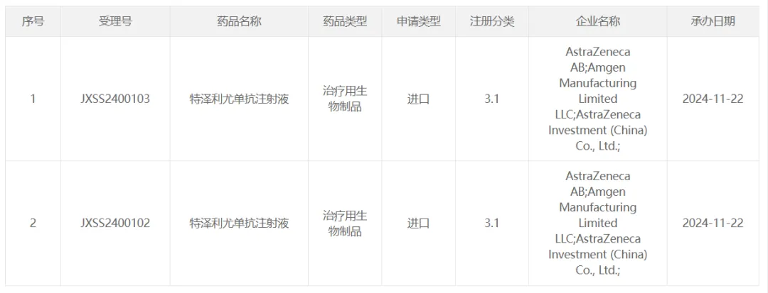 11 月 22 日,CDE 官网显示,阿斯利康和安进联合递交了 TSLP 单抗特泽利尤单抗注射液的上市申请。根据该药的临床研究进度,推测其本次申报的适应症可能是哮喘。在国内,特泽利尤单抗已完成一项治疗哮喘的 Ⅲ 期临床, 给药频率为每 4 周一次,皮下注射给药。