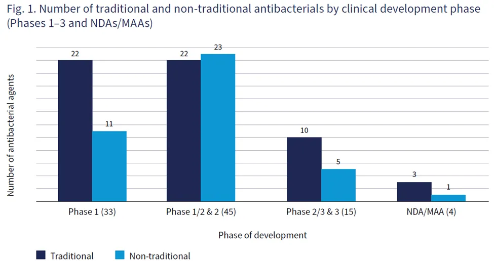 ▲截至2023年12月31日,按临床开发阶段划分的传统和非传统AMR药物数量(图片来源:参考资料[1])