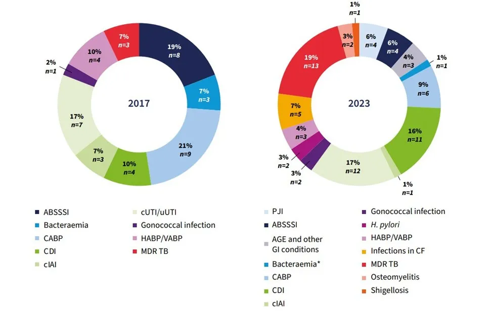 值得注意的是,2023年的药物研发管线显示,AMR药物在临床适应症方面有所扩展,新增了假体关节感染(PJI)、囊性纤维化(CF)患者感染、幽门螺杆菌感染和志贺菌病等适应症,而这些在2017年的分析中尚未涉及。尤其是CF患者的感染和PJI的治疗,这一扩展得益于越来越多专门针对这些复杂临床综合征的非传统抗菌药物的开发。