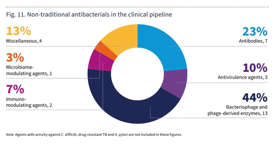 近年来,在对抗AMR的战役中,非传统药物也逐渐获得关注。这些药物旨在通过直接或间接抑制细菌生长、抑制毒力、改善抗菌耐药性、增强人体免疫系统以及正向调整或恢复健康的微生物群来预防或治疗细菌感染。目前,共有30款针对WHO重点病原体的非传统抗菌药物正在积极的临床开发中。其中,13种为噬菌体及其衍生酶,7种为抗体,3种为抗毒力剂,2种为免疫调节剂,1种为微生物组调节剂,另有4种属于其他类别的药物。这些药物通过创新机制为抗击AMR提供了新的潜在解决方案。