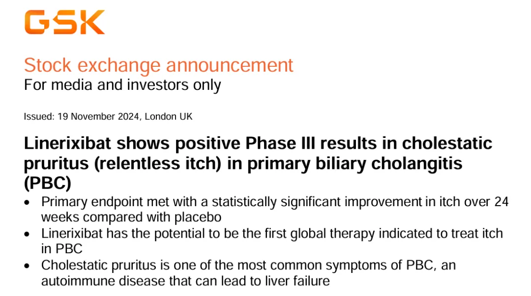 11月19日,葛兰素史克(GSK)宣布III期GLISTEN研究取得了积极结果。该研究旨在评估回肠胆汁酸转运蛋白(IBAT)抑制剂Linerixibat治疗原发性胆汁性胆管炎(PBC,一种罕见的自身免疫性肝病)相关的胆汁淤积性瘙痒(持续瘙痒)成人患者的疗效和安全性。