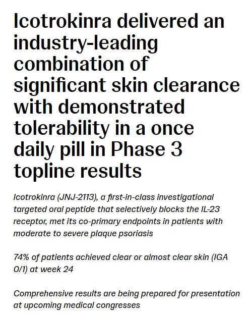 11月18日,强生宣布口服IL-23R拮抗剂Icotrokinra(JNJ-2113)治疗斑块状银屑病(PsO)的III期ICONIC-LEAD研究获得了积极的关键结果。这是第一款成功完成III期研究的口服IL-23R靶向药物。