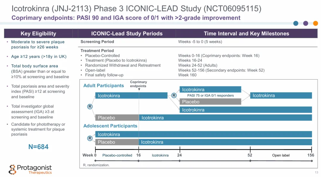 ICONIC-LEAD研究是一项全球性、多中心、随机、双盲、安慰剂对照临床试验(n=684,其中66例为青少年),评估了Icotrokinra对比安慰剂治疗患有中度至重度斑块状银屑病的12岁及以上青少年和成人患者的安全性和有效性。研究的主要终点为第16周达到银屑病面积及严重指数(PASI)至少改善90%(PASI 90)的患者比例和研究者总体评估(IGA,五分制)评分为0分或1分(IGA 0/1)且至少改善2分的患者比例。