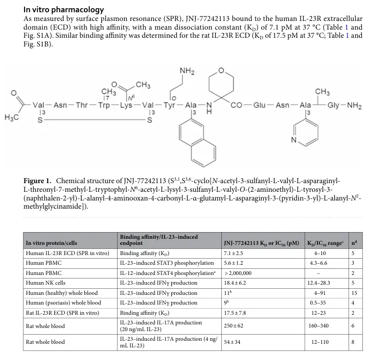 Icotrokinra是Protagonist Therapeutics开发的一款选择性阻断IL-23R的口服多肽药物,与IL-23R的结合亲和力可达到个位数的pM级别,具备治疗IL-23R介导的斑块状银屑病及其他炎症疾病的潜力。