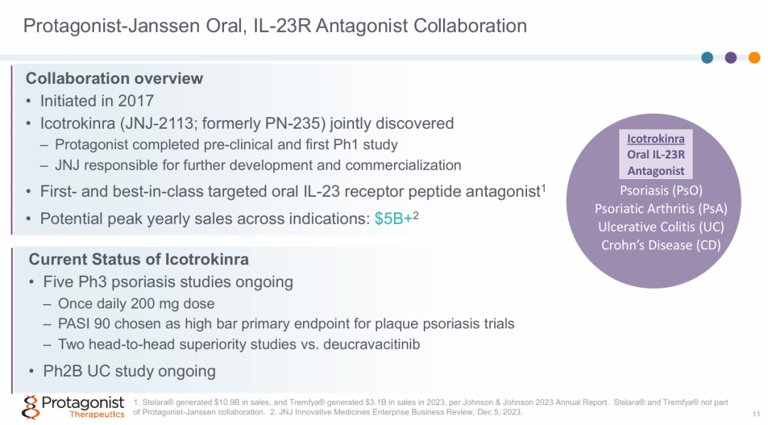 2017年,强生与Protagonist Therapeutics就开发一代IL-23R药物达成许可和合作协议。双方在2019年扩大了合作范围,将二代IL-23R药物包括在内,交易总额最高可达10.25亿美元。2021年,强生再次修订合作协议,获得两款二代IL-23R药物(Icotrokinra和JNJ-5186)的全球权益,交易总额最高可达9.8亿美元。