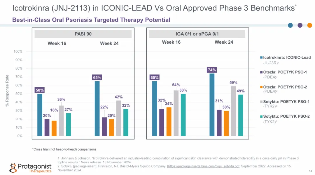 早在2017年,强生就慧眼识珠,与Protagonist建立合作关系。接着,通过两次深化合作,以及PTG-200和PN-232两款口服IL-23R靶向肽的失败探索之后,强生在2021年囊获的Icotrokinra终于开花结果,凭借ICONIC-LEAD和ICONIC-TOTAL两项研究有望解锁斑块状银屑病适应症。