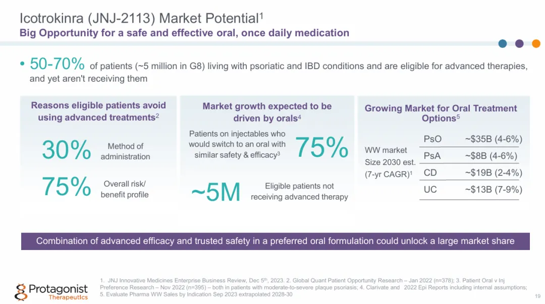 对于Icotrokinra的商业前景,Protagonist信心十足,给出预测——所有适应症的潜在年销售峰值在50亿美元以上。就银屑病适应症,Protagonist认为可能带来35亿美元左右的市场回报。据调查,可能有75%的患者愿意从注射剂治疗转向疗效与安全性相似的口服药物。