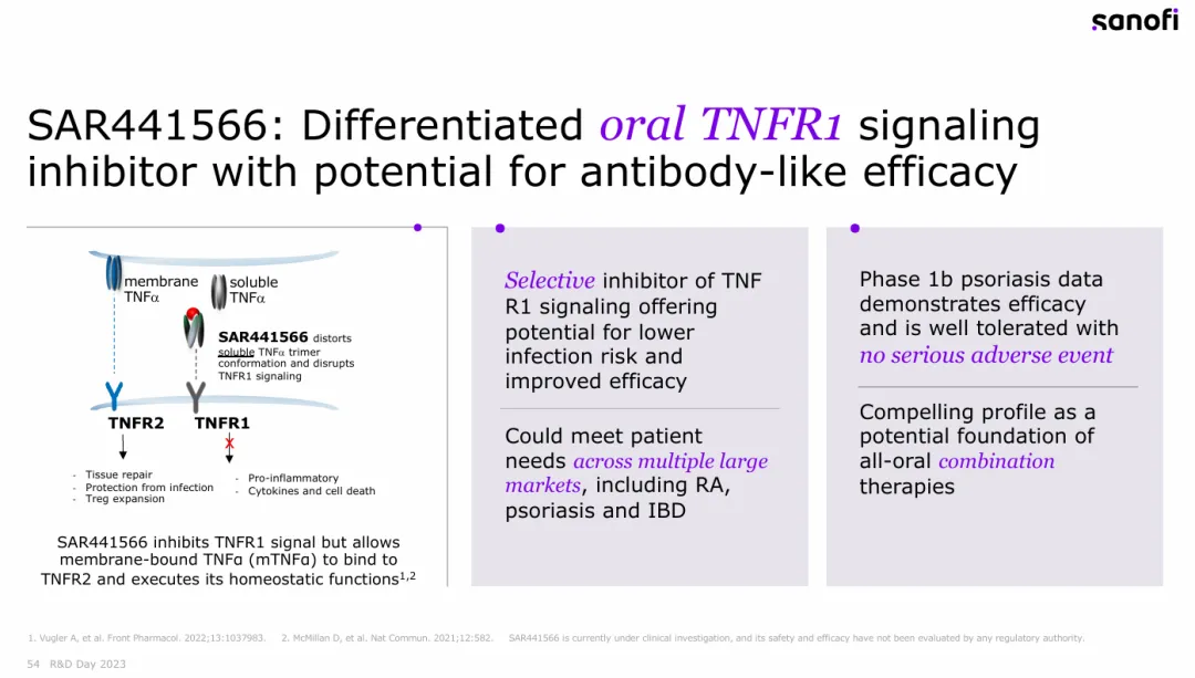 凭借如日中天的度普利尤单抗,赛诺菲在自免领域的地位迅速提升。雄心不止于此,它希望打造出真正的自免帝国。口服TNFα抑制剂SAR441566就是支撑起赛诺菲雄心的一大底牌。作为公司3款“pipeline-in-a-product”关键资产之一,赛诺菲预估SAR441566的潜在峰值销售额将超过50亿欧元。
