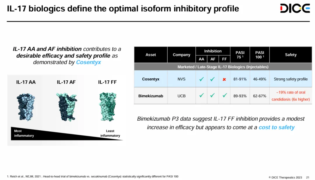 据DICE公司介绍,DC-806可同时抑制IL-17AA、AF两种二聚体。这种设计经过深思熟虑,之所以选择不抑制IL-17FF,是因为DICE公司从司库奇尤单抗和比吉利珠单抗的对比中发现,抑制IL-17FF可以适度提高疗效,但牺牲了安全性。不过,再精心设计的分子也需要承受失败的风险。进展较快的DC-806已成为弃子,礼来于2024Q3财报中移除了该管线。