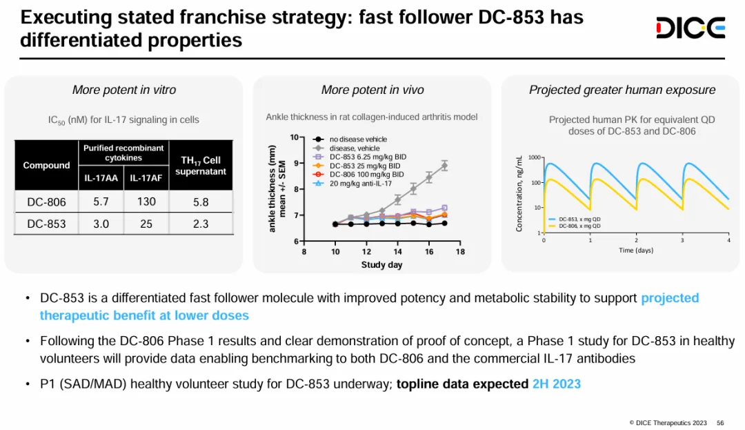 有生力量DC-853被DICE公司定义为DC-806的一种差异化“fast follower”,具有更好的效力和代谢稳定性,可实现更低的给药剂量。在今年9月,礼来启动了DC-853治疗斑块状银屑病的II期研究。