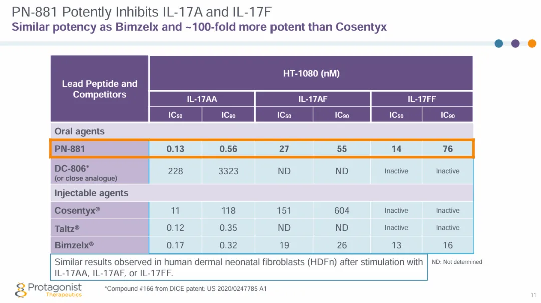Protagonist总裁兼首席执行官Dinesh V. Patel表示:“PN-881是一种潜在best-in-class口服多肽IL-17拮抗剂,在临床前测试中对IL-17配体的所有3种治疗相关二聚体形式都表现出很强的活性,其效力比其他抗IL-17口服小分子类似物高出几个数量级,优于或与各种已批准或开发阶段的注射抗体或纳米抗体相当。”