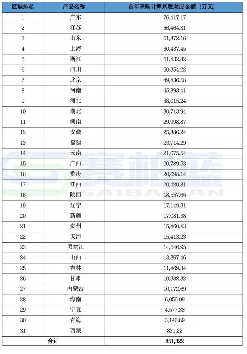 从对应的区域分布来看,大部分省份按照最高有效申报价计第十批集采首年合计采购金额在亿元以上。