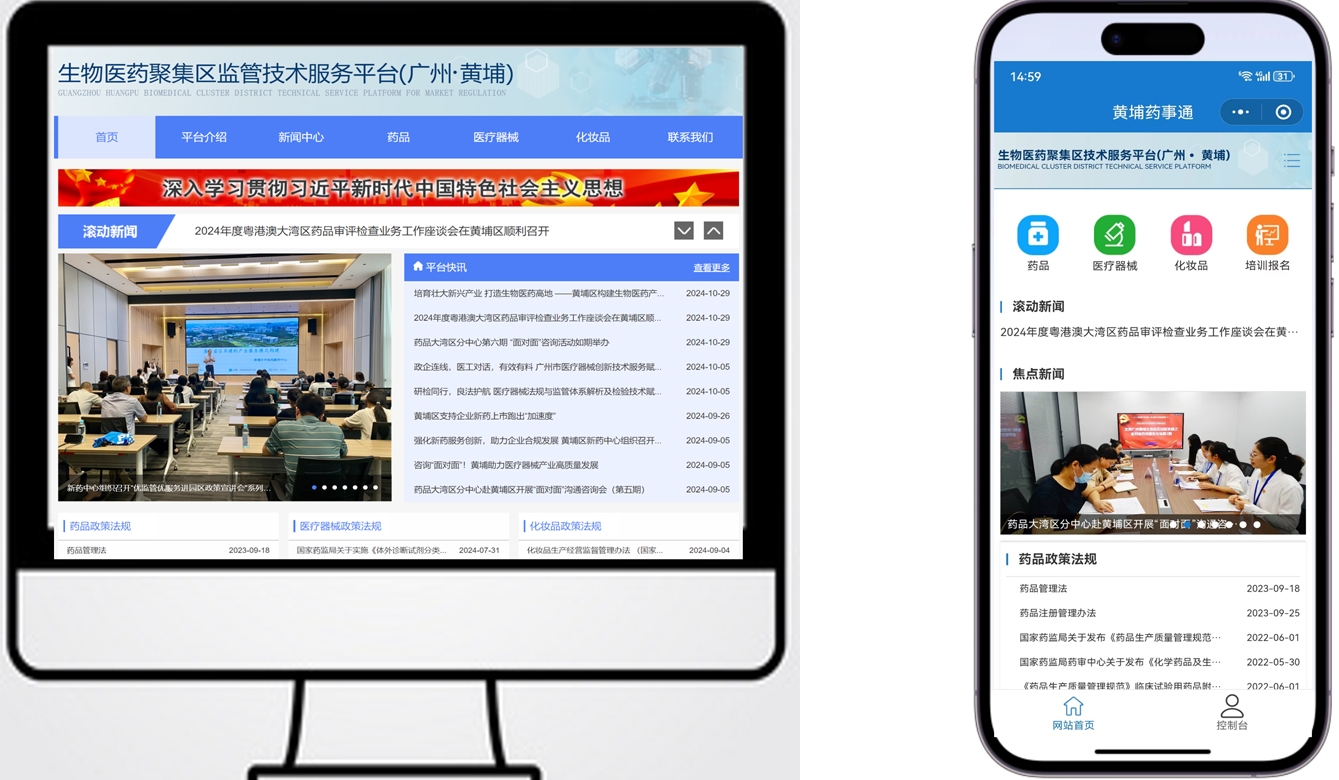 新药中心在广东省药品监督管理局的指导下,构建生物医药监管技术服务平台(广州·黄埔)线上服务平台,通过平台汇集第三方专业技术服务机构及专家资源,为药品、医疗器械、化妆品企业提供技术咨询、资料预审、模拟检查、检验检测等专业技术服务。近期,平台的二期开发已经完成,微信小程序“黄埔药事通”同步上线,实现PC端与小程序的双通道服务,区内企业“随时找、随时办”。