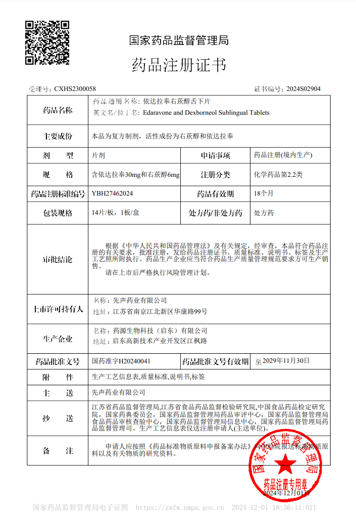 2024年12月2日, 先声药业(2096.HK)宣布,脑卒中创新药先必新®舌下片(通用名:依达拉奉右莰醇舌下片)于12月1日获国家药品监督管理局批准上市(批准文号:国药准字H20240041),用于改善急性缺血性脑卒中所致的神经症状、日常生活活动能力和功能障碍。