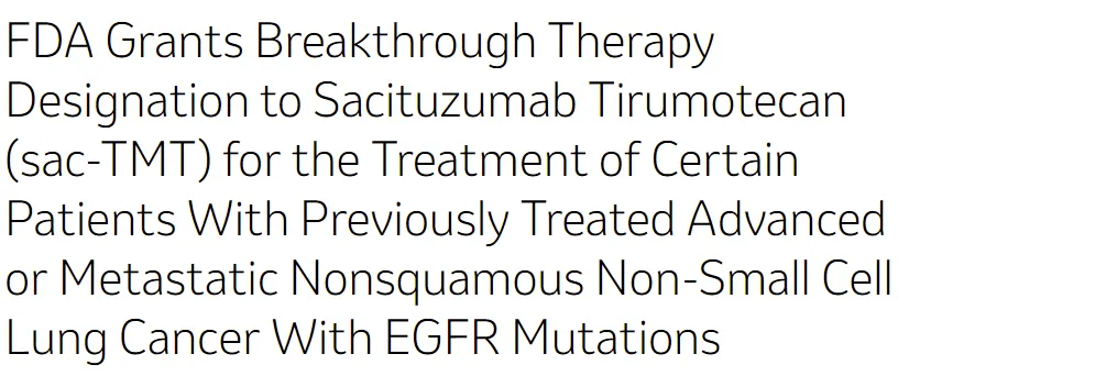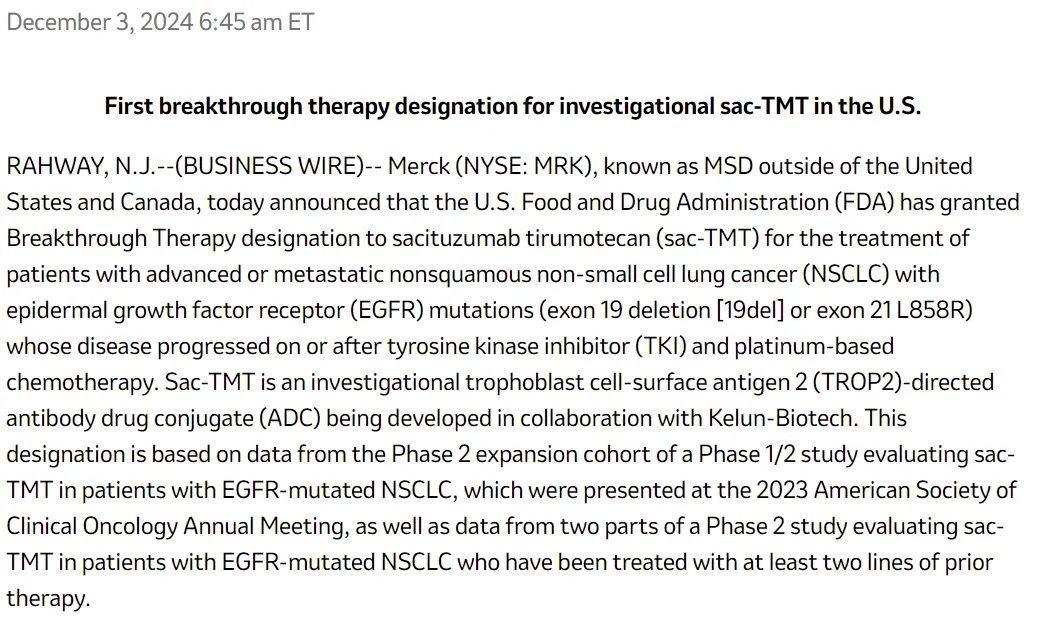 2024年12月3日,默沙东宣布FDA授予芦康沙妥珠单抗突破疗法认证,用于治疗EGFR突变(外显子19缺失或外显子L858R突变)、TKI和铂类化疗治疗进展后的非小细胞肺癌患者。此次突破疗法认证是基于意向评价芦康沙妥珠单抗治疗EGFR突变NSCLC 1/2期临床(该1/2期临床曾于2023年ASCO会议上汇报数据)的二期扩展部分数据,以及一项评估芦康沙妥珠单抗治疗既往至少经过二线治疗的EGFR突变NSCLC 2期临床的两部分数据。