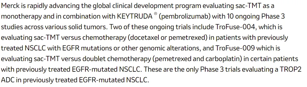 芦康沙妥珠单抗由科伦博泰研发,默沙东引进大中华区外全球权益。默沙东围绕芦康沙妥珠单抗开展了10项全球三期临床,其中TroFuse-004评估芦康沙妥珠单抗对照化疗(多西他赛或培美曲塞)治疗经治EGFR突变或其他基因突变NSCLC,TroFuse-009评估芦康沙妥珠单抗对照双化疗(培美曲塞和卡铂)治疗经治EGFR突变NSCLC。这是唯一评估Trop2 ADC芦康沙妥珠单抗治疗经治EGFR突变NSCLC的三期临床试验。