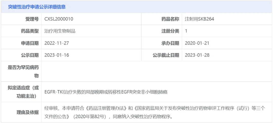 2023年1月,芦康沙妥珠单抗同样获得NMPA授予突破疗法认证,用于经EGFR-TKI治疗失败的局部晚期或转移性EGFR突变NSCLC成人患者。