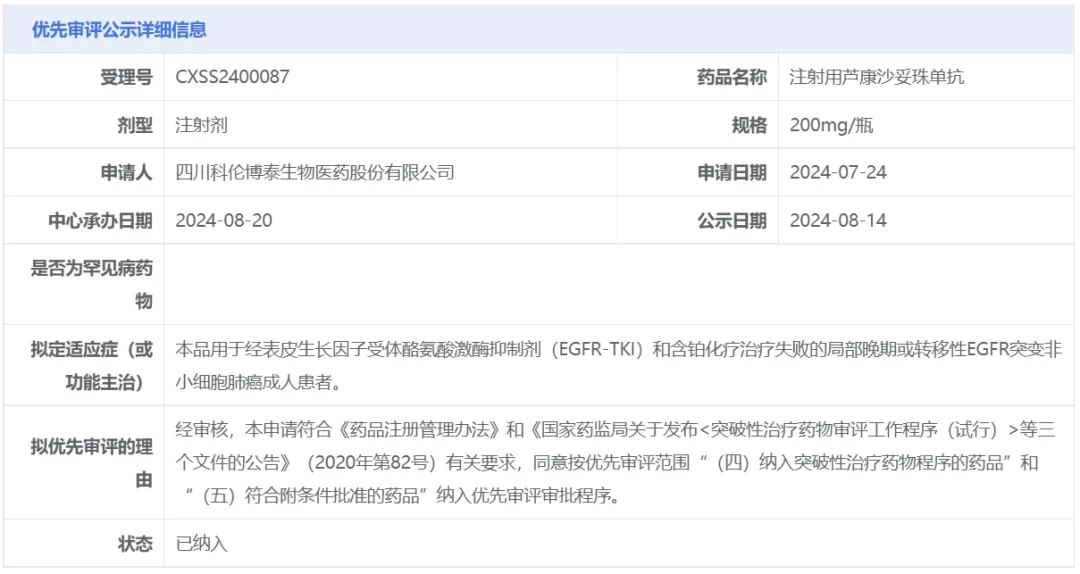 此前的2024年8月,芦康沙妥珠单抗对EGFR-TKI和含铂化疗治疗失败的局部晚期或转移性EGFR突变非小细胞肺癌也被纳入优先审评。