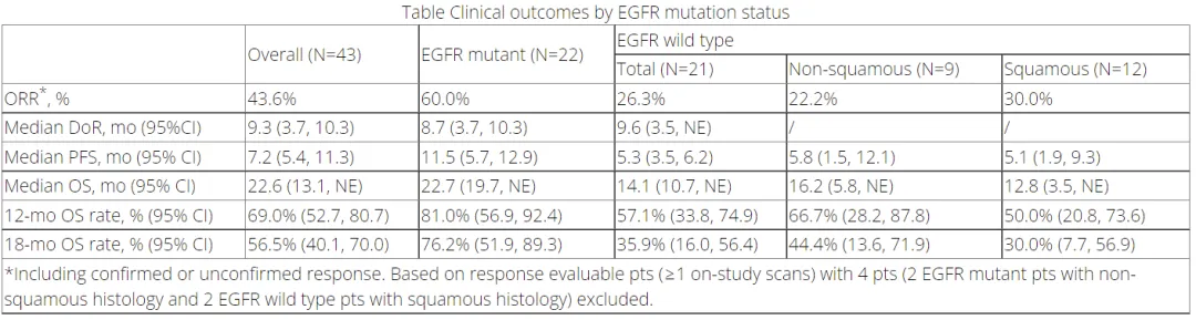根据2024年AACR会议上公布的二期临床(NCT04152499)数据,22例EGFR突变患者,ORR为60%,mPFS为11.5个月,12个月OS率为81.0%,18个月OS率为76.2%。