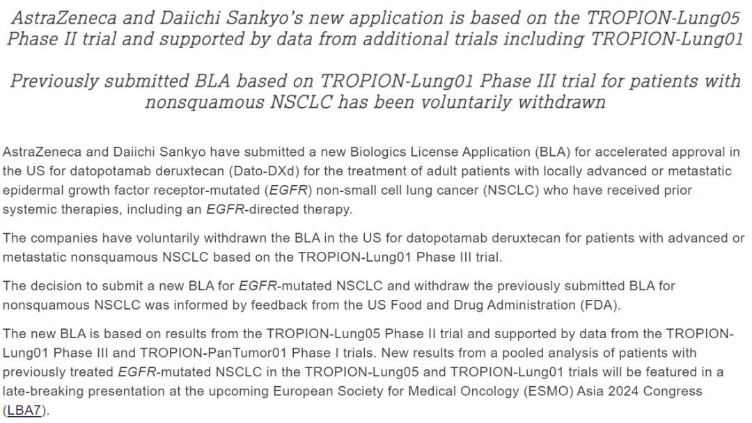 今年11月,阿斯利康宣布撤回此前基于TROPION-Lung01三期临床数据递交的治疗非鳞状NSCLC的上市申请,转而递交复发性或转移性EGFR突变NSCLC的后线治疗上市申请,这一申请是基于TROPION-Lung05二期临床(以及TROPION-Lung01支持数据)、TROPION-PanTumor01一期临床数据。