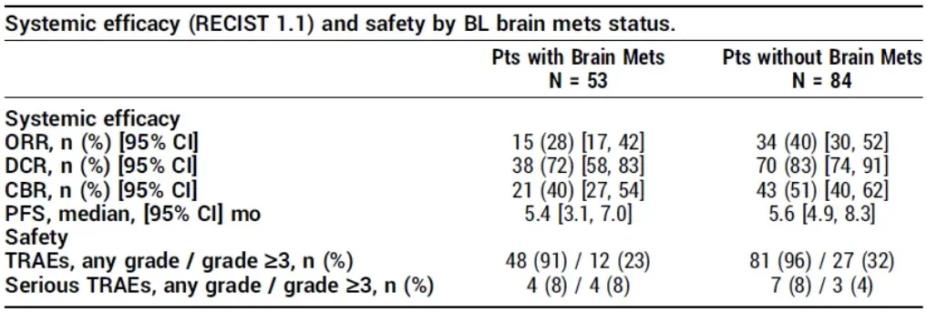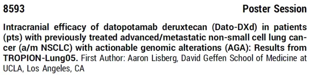 今年ASCO会议上,阿斯利康披露了TROPION-Lung05最新数据,这是一项针对驱动基因突变(AGA)复发性NSCLC的单臂二期临床,对于无脑转移的患者ORR和DCR分别为40%和83%,对于脑转移患者的ORR和DCR分别为28%和72%,mPFS为5.6个月。