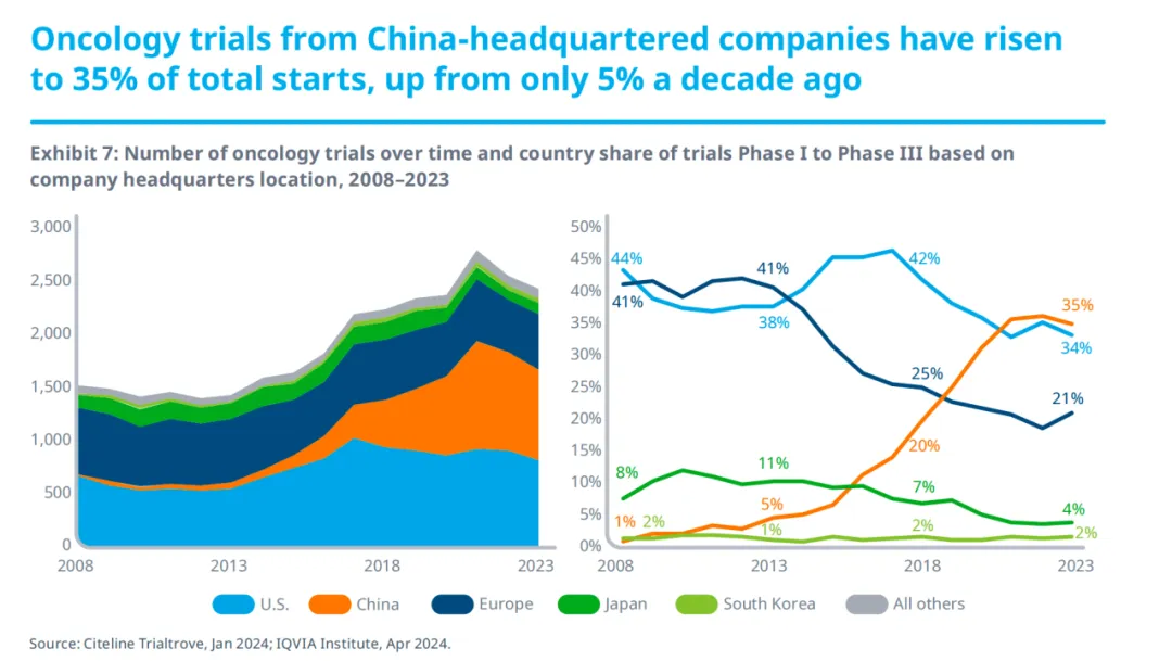 如前文所说,目前国内biotech/biopharma们在肿瘤领域的布局已经到了不容忽视的程度,这个时代,中国的biotech将会在全球肿瘤管线中占有举足轻重的作用。根据IQVIA发布的《Global Oncology Trends 2024》,2023年位于中国总部的药企开启的肿瘤学临床试验已经超过了美国:中国占比35%,美国占比34%。而在五年前,这个数字仅仅是20%,2008年,这个数字仅仅是1%。