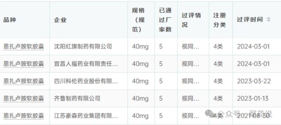 其它高垂直度药物呢?恩扎卢胺主要针对前列腺癌,是非常典型的雄激素受体拮抗剂,该药面临的一个最大问题是:专利将要到期。恩扎卢胺2012年FDA获批上,2026年专利到期,而国内的仿制药已经早早开始准备冲击该市场:2021年江苏豪森药业的仿制药首先过评,此后,科伦,人福,齐鲁等熟知的国内大药企都竞相抢占该市场。截至2024年6月,已经有5家药企的恩扎卢胺仿制药过评。