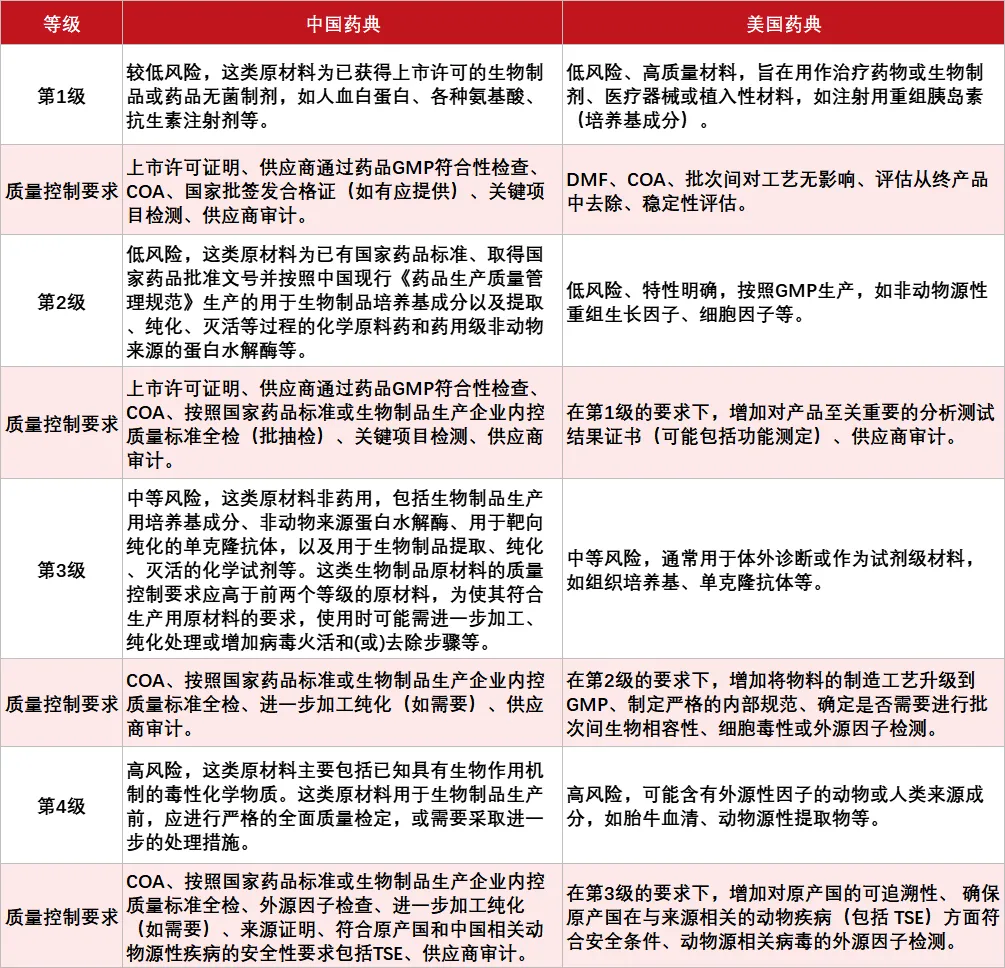 可以看到,从第1级到第4级,其对应质量控制要求存在较大区别,高风险等级的原材料不仅质量控制要求更加复杂,且被建议在产品研发早期就评价使用这些原材料的必要性,并寻找其他替代物。FDA也持相同的态度,建议使用可获得且可行的最高质量的原材料。