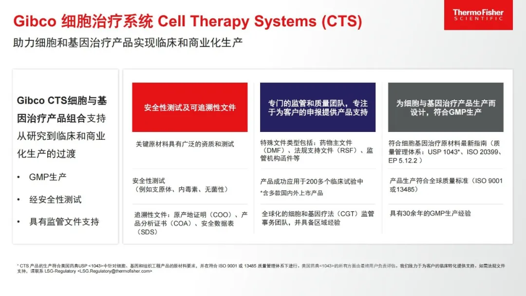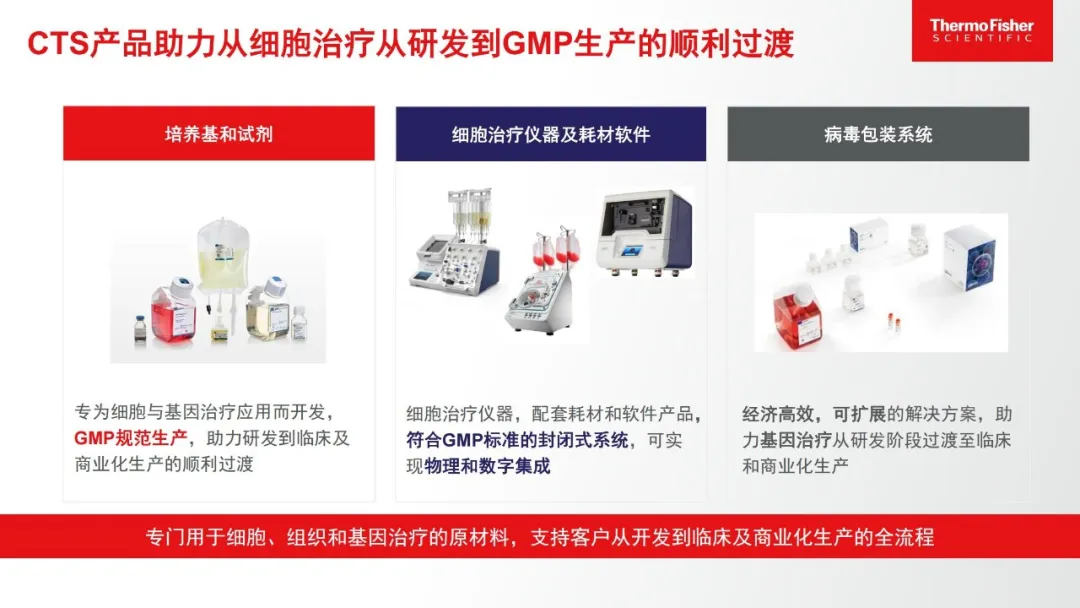为助力细胞治疗企业能够从前期研究顺利扩展到临床和商业化阶段,赛默飞基于细胞治疗生产企业的产品和生产工艺特点,推出了Gibco细胞治疗系统(CTS, Cell Therapy Systems)系列产品,所有CTS系列产品均按照GMP标准生产,经过安全测试,并附有法规支持文件以帮助企业简化治疗药物开发过程,以更大限度地降低风险,并减轻质量体系管控的负担。
