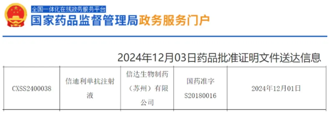 图1. 信迪利单抗获批上市,来源:NMPA官网