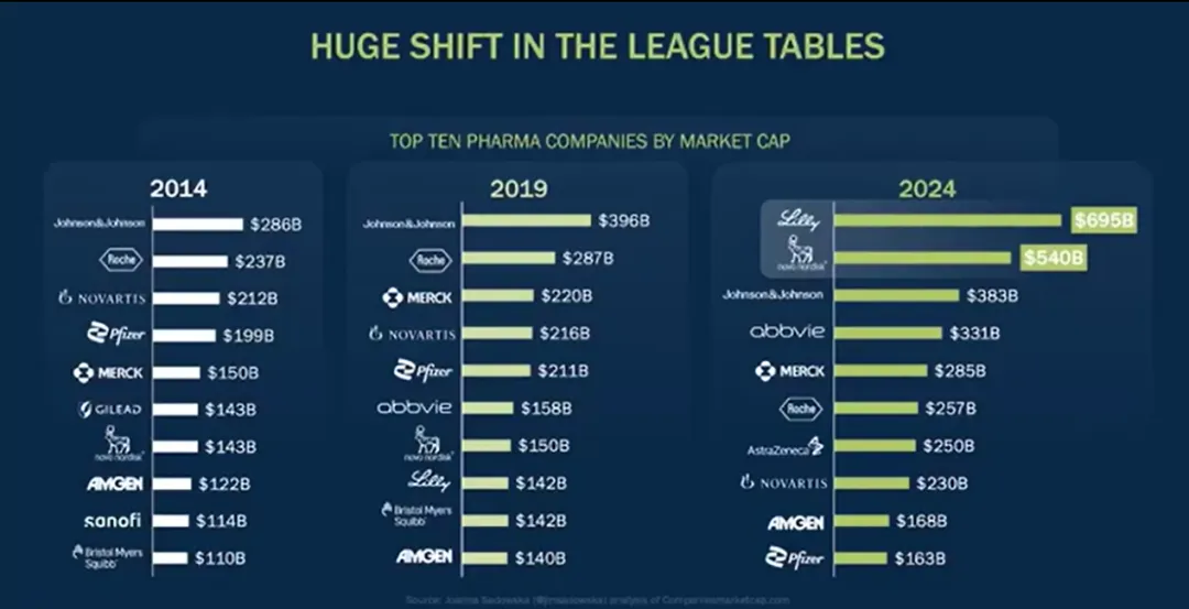 肥胖症已经真正颠覆了制药行业的排行榜。2014年时,市值最高的5家药企——强生、罗氏、诺华、辉瑞、默沙东已经长期雄踞榜首。2019年,TOP5仍然没有受到威胁,只是它们之间的排名有所波动。而今年,礼来和诺和诺德因为“减肥药”登顶,尤其是礼来,2014年甚至不在TOP10的排行榜上,同时辉瑞等“老钱”已经掉到了队尾。