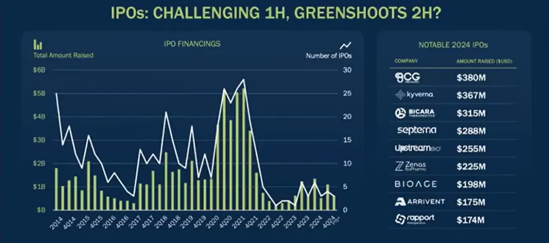 IPO方面,2024年的情况比2022年要好,今年截至目前有17或18个IPO,但还是不及过去10年平均每季度10~15个IPO的常态。不过,好的一面是,Biotech还能来到二级市场,而且IPO的市值中位数超过4.5亿美元,这是10年前的3倍。