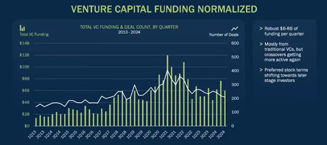一级市场的风险投资总体上已经正常化,过去几个季度大约保持着6~8亿美元/季度的募资速度。我们认为这可能是新常态,是十年前每季度获得的资金的3倍,也仍然低于疫情泡沫中的情况。大多数来自传统VC,也有另类资产管理公司、主权财富基金、家族办公室等。