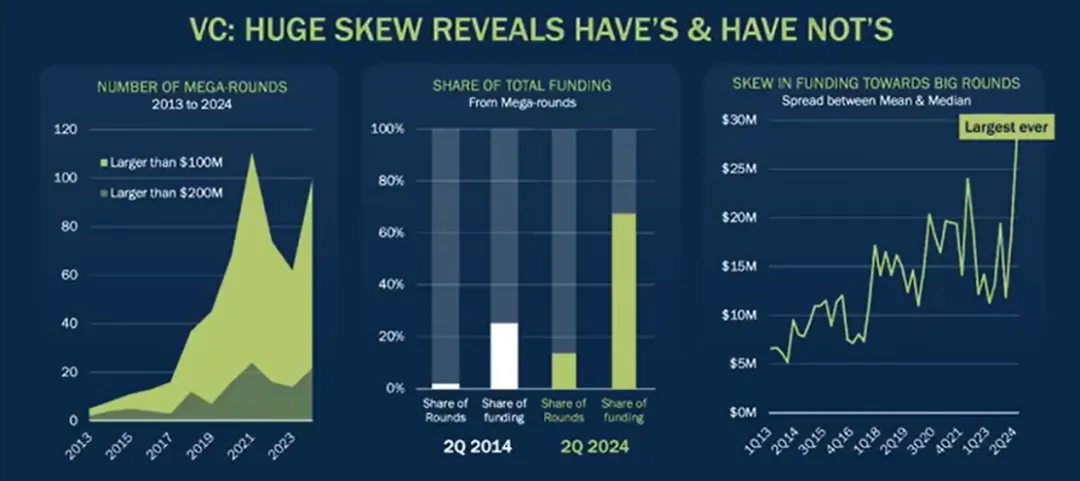这意味着大量资本集中在少数公司。10年前,全部交易中只有百分之几是巨额融资,占用了总交易金额的25%,而今天,15%的交易为巨额融资,占用了总交易金额的65%。