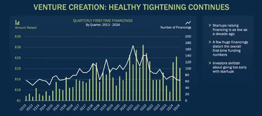 我认为最有趣的数字是首次融资的公司数量——今年的这个数字是60,与10年前一致。我认为这是生态系统的健康回撤,我们会将早期的人才、资本和科学集中到更少的公司。