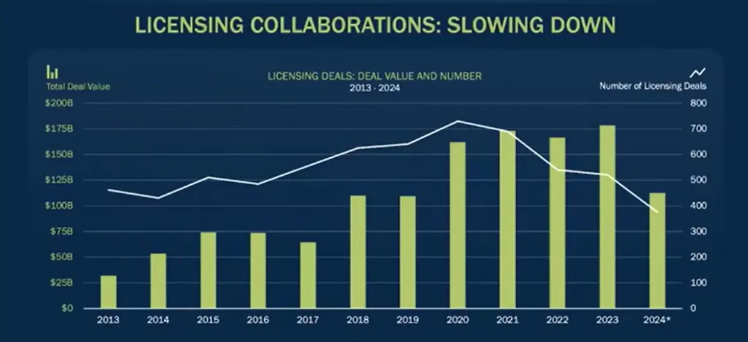 在全球头部药企的授权许可交易中,也可以看到这种趋势:今年的交易总量相较于前几年下降了50%~60%至大约400起,与2019~2020年的水平相当,但交易金额比当时高了很多,尤其可以见到巨额首付款和里程碑付款。