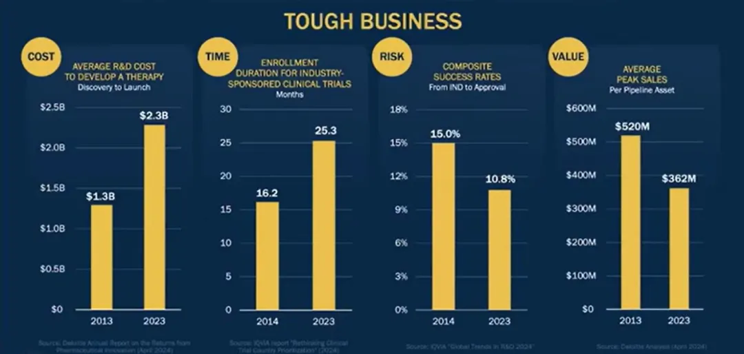 制造药物确实很难,现在变得更难。将药物带到市场的成本在过去十年中有所上升。临床试验入组时间增加了50%。成功率仍然低得令人难以置信:1/10。最后,从价值的角度来看,TOP20药企的平均管线价值在过去十年中有所下降。